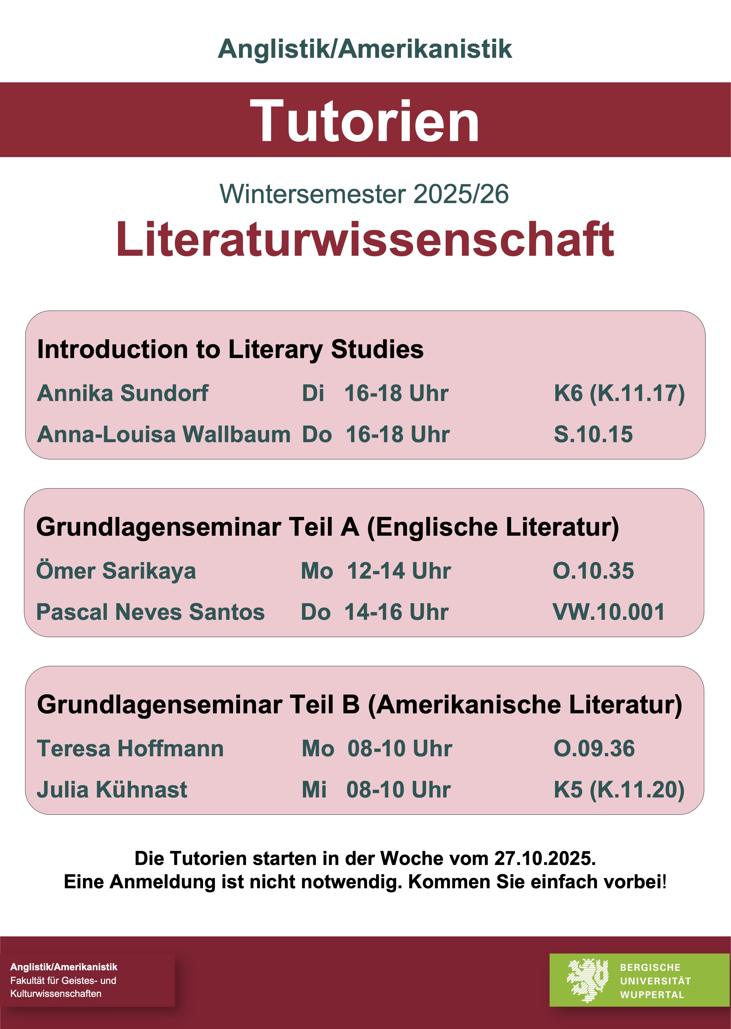 für das Seminar Introduction to Literary Studies und die Grundlagenseminare Teil A (Englische Literatur) und Teil B (Amerikanische Literatur) bieten wir Tutorien an. Diese beginnen in der Woche vom 27.10.2025.